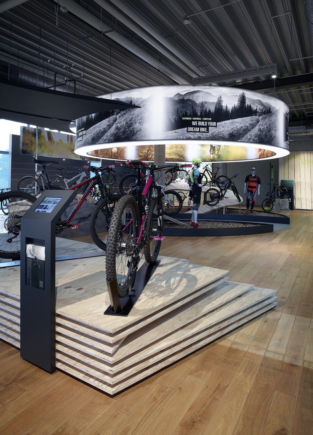 Den Zusammenhang bemerke ich erst durch das Beobachten der Kunden. Die, erkennbar als Teil der Inszenierung, sitzen entweder im Schaufenster und probieren ihre Sneaker oder spielen an den digitalen Entdeckerkonsolen: