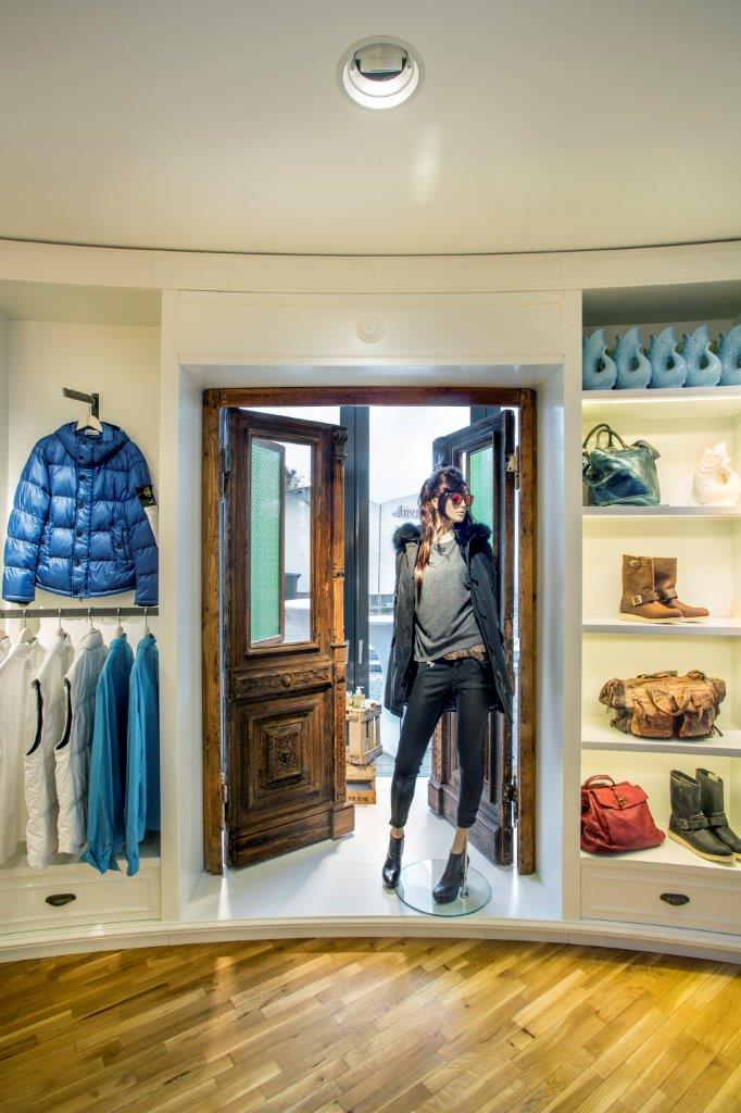 Schon im Außenauftreten überrascht der Konzeptstore mit einem echten Hingucker – die gläserne Garage, welche als Ausstellungsfläche für restaurierte Oldtimer genutzt wird.